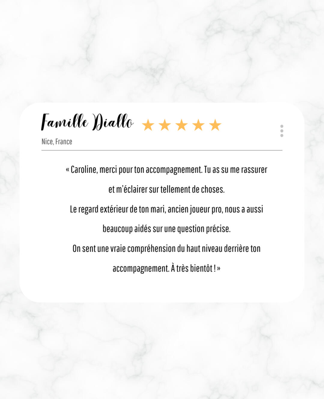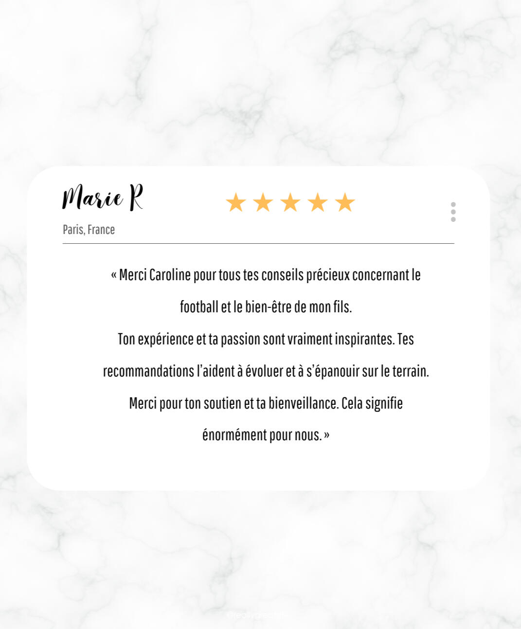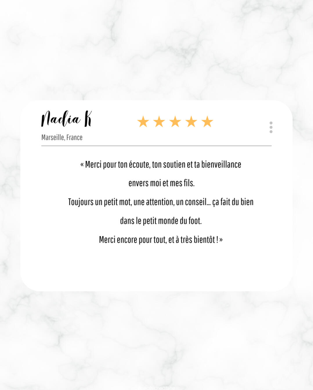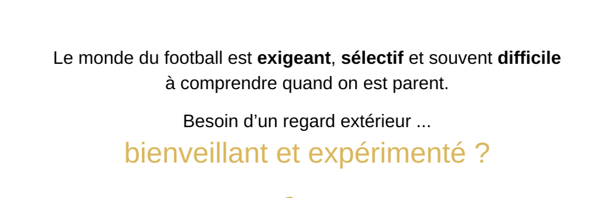 Que chaque famille trouve l'équilibre nécessaire pour aider son enfant à s'épanouir sur le terrain.J'ai la certitude que les fondations d'une potentielle carrière se construisent aussi hors du terrain. J'ai à coeur de sensibiliser les familles sur cette réalité.Bâtir ses repères, être à son écoute, valoriser sa progression... Créer l'environnement sain et sécurisant dont le jeune footballeur a besoin pour s'épanouir.Quand j'accompagne une famille, je lui porte la même attention, le même soutien et la même douceur qu'à mon enfant.